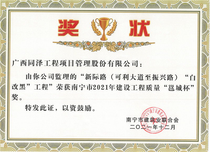 新際路(可利大道至振興路)“白改黑”工程榮獲南寧市2021年建設工程質量“邕城杯”獎